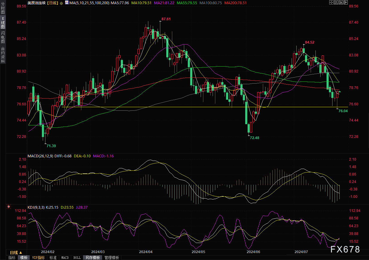 下方继续关注76附近支撑,若意外下破该支撑,则可能会跌向6月份低点72.48附近。