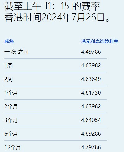 7月26日,港元拆息偏软,其中,隔夜息连跌两天,跌穿4.5%,报4.49786%。与楼按相关的一个月拆息在两连跌后,今日维持4.6175%,为7月15日以来最低。