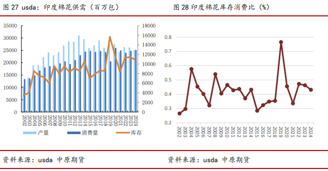 Usda7月报告预计印度24/25年度产量2500万包,同比减4.58%;进口量150万包,同比增66.67%;消费量2550万包,同比增2%,库存1017.4万包,同比降低4.68%。