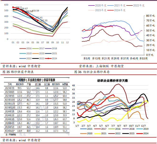 2024年下半年,主要是新花上市和金九银十的需求。对于美棉来说,三季度是棉花生长的关键期,天气影响还存在不确定性,四季度新花上市,出口进度是主要因素。对于国内棉价来说,三季度是疆棉生长期,9月份开始要关注籽棉收购价预期,还有下游需求旺季成色。所以,单从季节性来看,郑棉走势可能在7-8月份继续磨底(需求淡季),9-10月份下游需求预期或提振反弹,年度或再次回落。但是具体走势还需要看当时基本面。