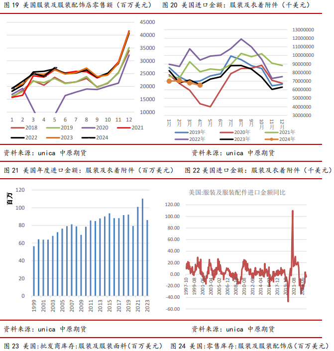 纺织服装库存持续去化,未来刚性补库或会提振阶段性需求。消费端看,5月美国服装及配饰店销售额同比增加2.44%,环比增加0.9%,内需消费动力尚可。从零售端库存看,4月份服装零售库存环比增加,绝对数量尚在高位。批发商库存看,5月份批发商服装库存继续回落。5月份美国服装批发商库存环比降0.72%,同比降20.68%。批发商库存在2月份环比增加,但3月份重回下降,说明补库持续性不足,目前补库需求尚未释放。从绝对值上看,美国的服装批发商的库存降至了疫情前的区间水平里,库存压力不大,但是零售端的服装库存尚在高位,说明终端库存仍然充足,往消费者端传导还需要时间。进口端看,2023年美国服装及衣着配件进口金额为859亿美元,同比下降22%,大幅低于前两年,且下降至近十年偏低水平。当前利率水平高,也抑制了投机性补库需求,未来一年美国的服装需求或仅为阶段性的刚需补库。库存需要时间消耗,预计随着降息开始,利率下降,持货成本降低,那时候投机性补库或开始。