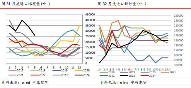 进口量的大增是今年棉价下跌的一个重要因素。近年来,我国每年进口棉花约200万吨,23/24年度累计(9-5月)进口273万吨,同比增167.5万吨。2024年1-5月累计进口164万吨,同比增115万吨。今年1-5月份进口量均维持在高位。按照进口利润和签约情况,后期进口量预计仍然不低。单就美棉看,中国23/24年度签约美棉120万吨,已经到港约68万吨,所以6-8月份仍有约50万吨的美棉压力。今年巴西棉大丰收,当前棉花开始收获,预计巴西棉进口压力将在下半年释放。后期的进口压力除了进口量之大外,还有进口配额的发放,配额发放将使得进口棉入关,造成实质性的供给压力。