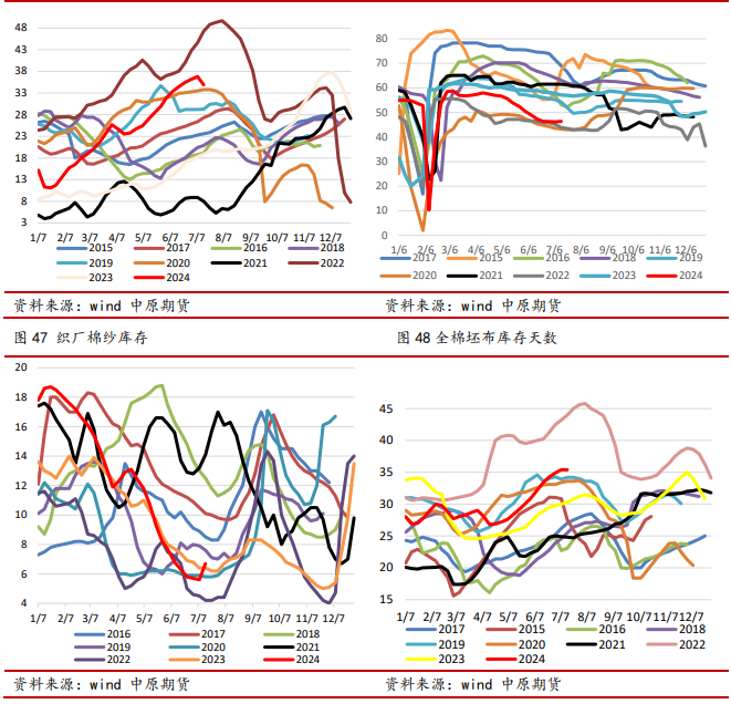 棉纱库存看,截至6月份的全国棉纱库存在去化,小于去年四季度,但也仍处于历史偏高水平,去化进度偏慢,其中纺织厂的库存压力较大,仅次于2022年水平。在利润和订单偏弱的当下,棉纱的高库存抑制了对棉花的需求。近年来,新疆的纱线产能和织造产能在扩张,棉纱生产成本优势远大于内地,在比较优势存在的情况下,预计全国棉纱高库存或在未来一年成为常态。