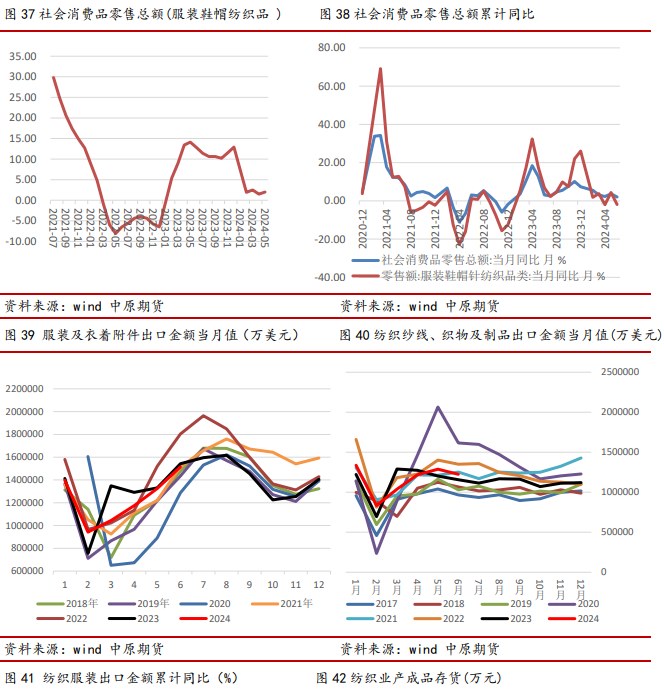 出口方面,2024年6月我国出口纺织品服装273.95亿美元,同比增加1.5%,其中出口纺织纱线、织物及制品122.49亿美元,同比增加5.9%,1-6月累计出口694亿美元,同比增3.3%;出口服装及衣着附件151.46亿美元,同比减少1.8%,1-6月累计出口纺织品服装738亿美元,同比持平去年。出口方面比去年略好,但出口动能不足,二季度同比增速明显下滑。