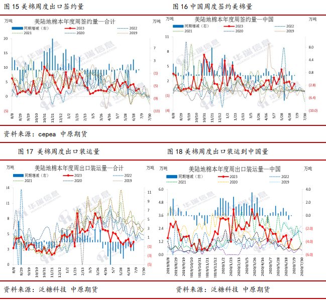 最近一个月,美棉出口签约数据大幅下滑,装运量亦明显下行,显示需求仍较为疲软。下年度棉花签约数据下滑,在下年度棉花供应偏宽松的预期下,尽管目前价格处于偏低水平,但买方保持谨慎,显示需求疲态。