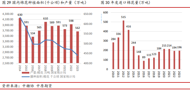 2023/24年度减产,但进口大增,库存增加。中国棉花协会预测2023/24年度,全国棉花产量587.7万吨,同比下降11.3%;棉花进口量317万吨,同比增长1.2倍,较上期上调51万吨;消费量790万吨,同比增长4%;期末库存相应调整为986.6万吨,同比增长12.8%。