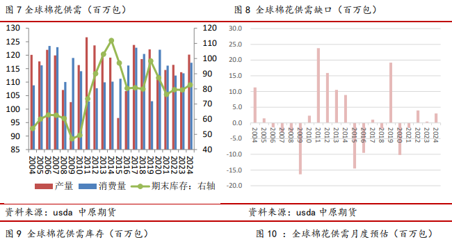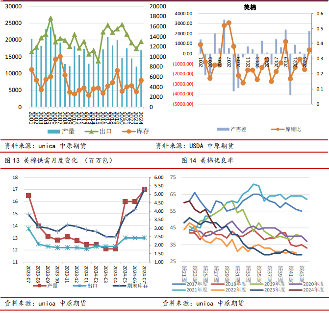 24/25年度美棉增产增库存,供给极大程度恢复。6月底USDA美棉种植面积报告,棉花种植面积预计同比增加14%,为1170万英亩。其中,陆地棉种植面积预计为1150万英亩,较2023年增长14%。美国皮马棉种植面积预计为18.2万英亩,较2023年增长24%。早前预计为1067.3万英亩,比去年增长4%。7月usda供需报告显示,2024/25年度美国棉花种植面积、产量、期末库存同比增加。美国棉花产量预计1700万包,同比40.89%,环比调增6.52%;出口量1300万包,同比增加12.07%,环比不变;美国期末库存530万包,同比增加73.77%,环比调增29.27%,库存攀升至2009年以来的次高位;库存消费比上升到36%。