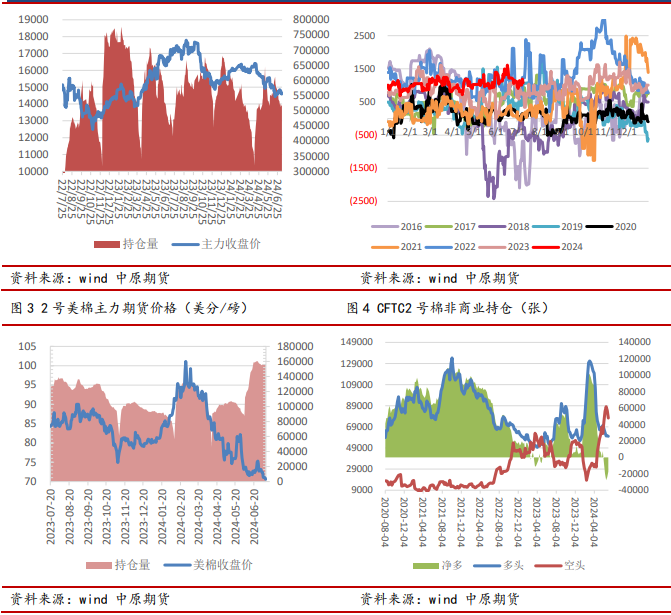 2024/25年度种植面积小幅下降,天气适宜,催生增产预期。国家棉花市场监测系统5月下旬,2024年全国棉花实播面积4083.3万亩,同比减少56.9万亩,减幅1.4%。目前全疆大部分区域持续高温,但对新棉生长影响有限,且今年病虫害发生程度较轻,棉花生长进度较去年提前5-10天左右,当前大部分产区棉花处于盛花期,市场对2024/25年度新疆棉花单产、总产量“双丰收”存较强预期。