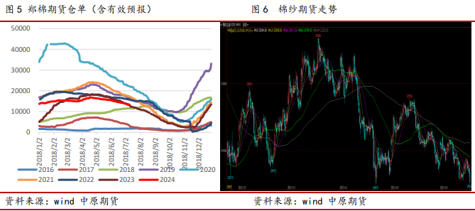 分阶段看,1-4月中旬:郑棉从2023年12月开始持续上涨至2月底,价格逼近16600附近,然后3月-4月初维持高位震荡,主要逻辑是春节前提前补库,需求提振。