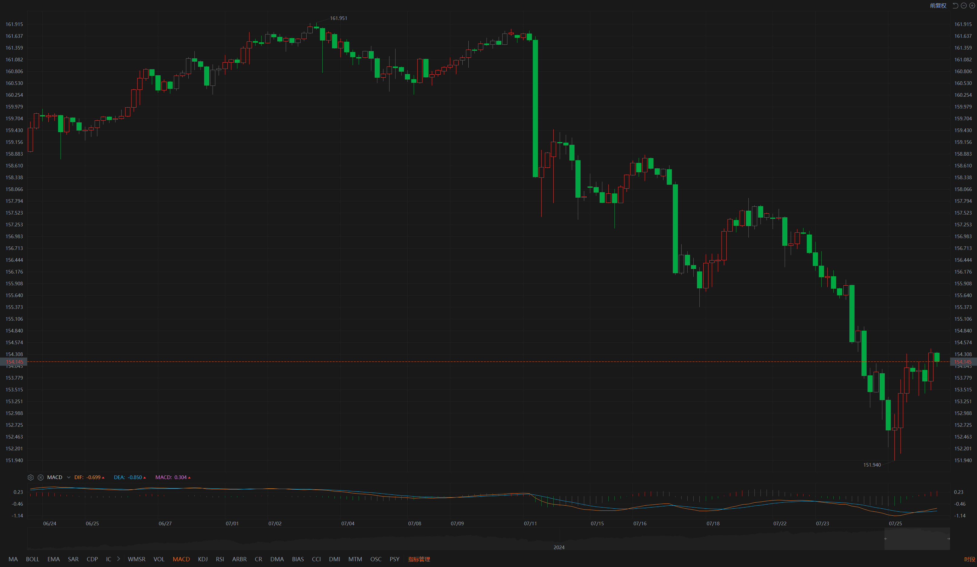 日元汇率自7月11日开始飙升,兑美元汇率保持约5%的升幅,美元兑日元汇率一度从161.915跌至152水平,截止发稿,美元兑日元报154.12。