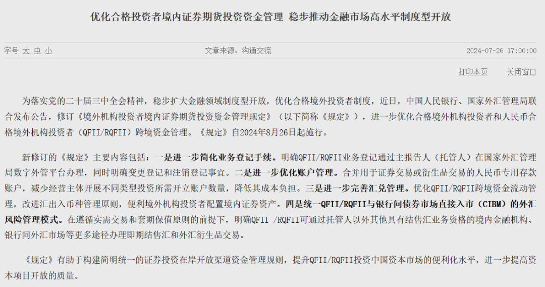 近日,中国人民银行(下称“央行”)、国家外汇管理局联合发布公告,修订《境外机构投资者境内证券期货投资资金管理规定》(下称《规定》),进一步优化合格境外机构投资者和人民币合格境外机构投资者(QFII/RQFII)跨境资金管理。《规定》自2024年8月26日起施行。