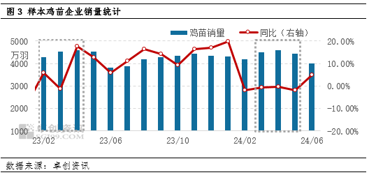 通过养殖周期推算,三季度新开产蛋鸡为2024年3-5月补栏的鸡苗,而理论可淘汰蛋鸡为2023年2-4月补栏的鸡苗,通过数据评估7-8月新开产蛋鸡数量均大于淘汰鸡出栏量,9月开始新开产蛋鸡数量小于淘汰鸡出栏量,产蛋鸡理论存栏量增幅逐渐收窄,9月或开始下降。因此三季度产蛋鸡存栏量处于周期内高峰位置,或在一定程度上限制蛋价涨幅。