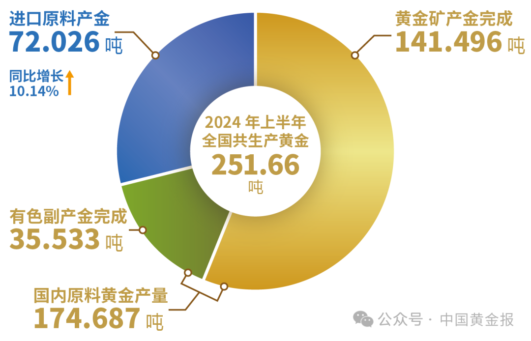 据2024中国国际黄金大会权威数据发布论坛上披露:2024年上半年,国内原料黄金产量为179.634吨,与2023年同期相比增产1.036吨,同比增长0.58%,其中,黄金矿产金完成141.496吨,有色副产金完成38.138吨。另外,2024年上半年进口原料产金72.026吨,同比增长10.14%,若加上这部分进口原料产金,全国共生产黄金251.660吨,同比增长3.14%。