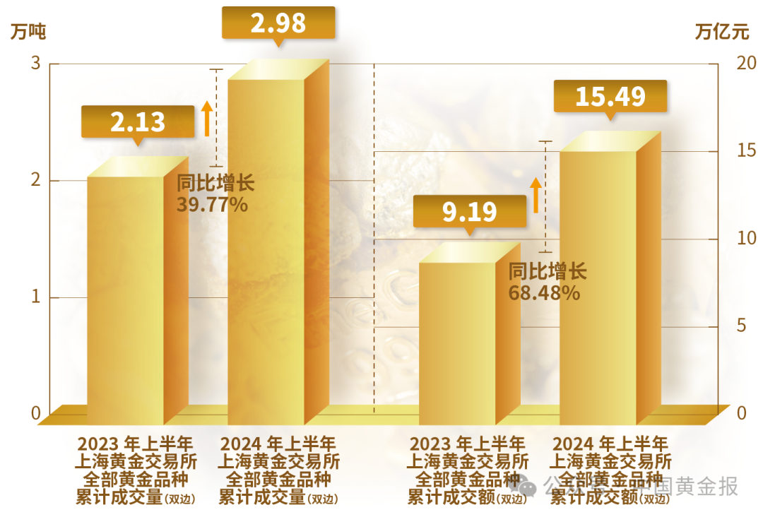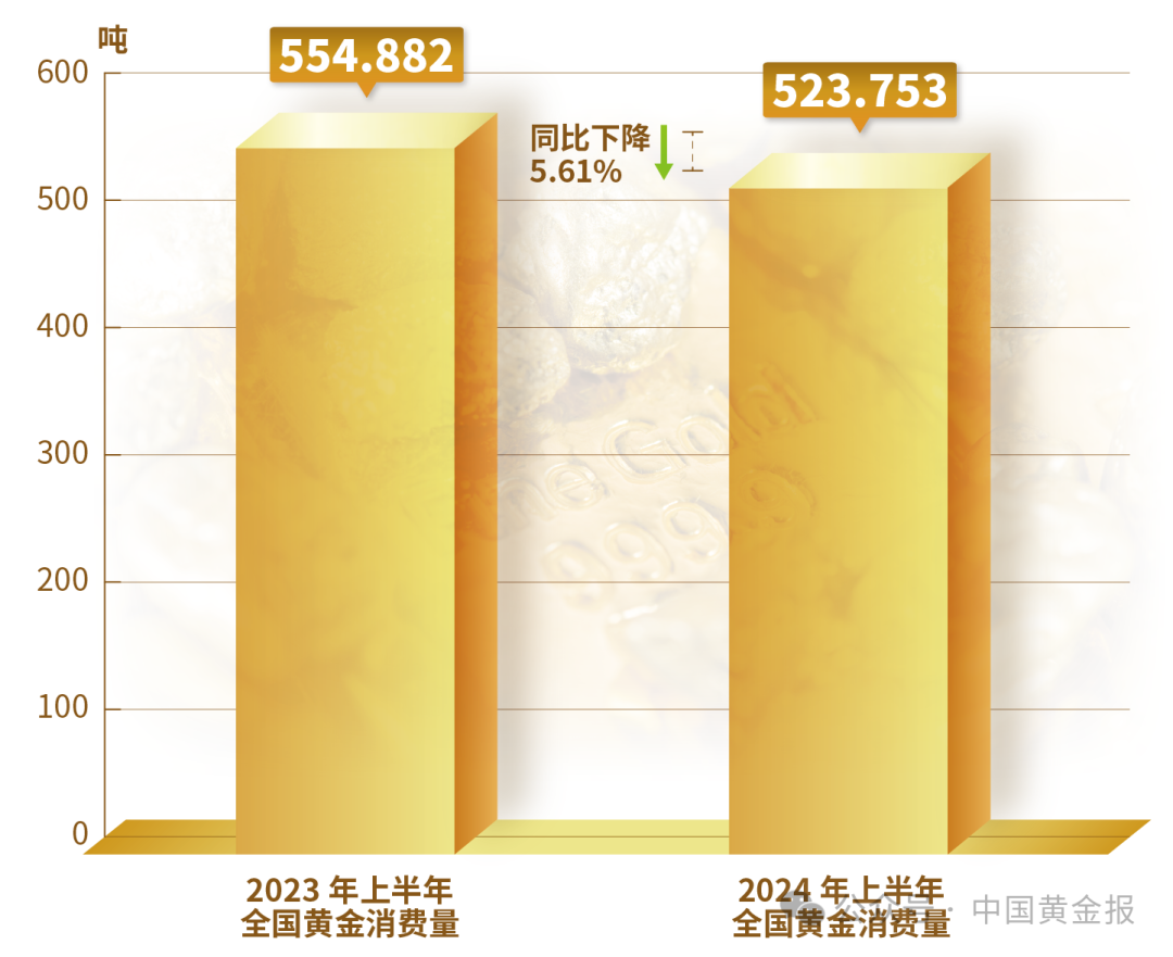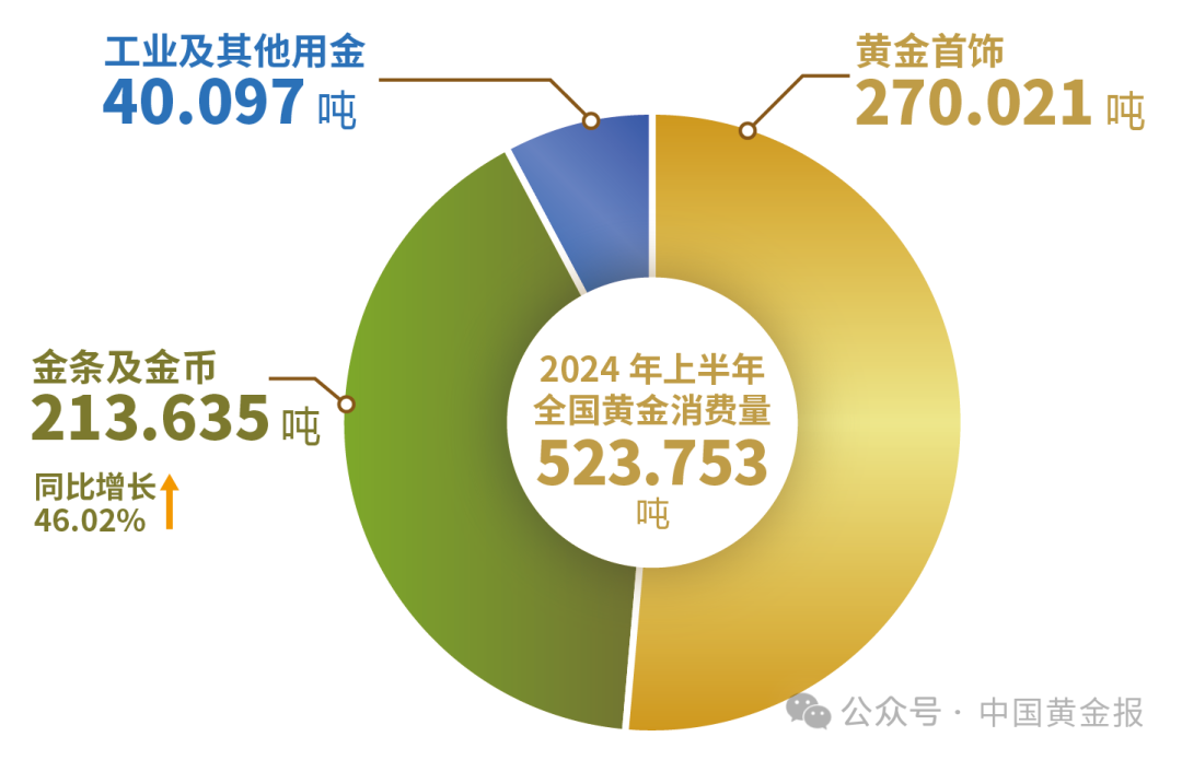 2024年上半年,全国黄金消费量523.753吨,与2023年同期相比下降5.61%。其中:黄金首饰270.021吨,同比下降26.68%;金条及金币213.635吨,同比增长46.02%;工业及其他用金40.097吨,同比下降0.53%。