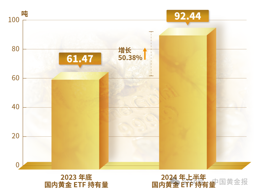 2024年上半年,上海黄金交易所全部黄金品种累计成交量双边2.98万吨(单边1.49万吨),同比增长39.77%,成交额双边15.49万亿元(单边7.74万亿元),同比增长68.48%。上海期货交易所全部黄金品种累计成交量双边8.01万吨(单边4.01万吨),同比增长34.74%,成交额双边35.67万亿元(单边17.84万亿元),同比增长58.58%。2024年上半年,尤其是进入3月份以后,黄金价格上涨较快,交易量环比大幅上升。为此,国内黄金场内交易一度采取市场风险控制措施。上海黄金交易所发布通知提高黄金延期合约交易保证金比例及涨跌幅度限制,上海期货交易所则对黄金期货品种实施交易限额,并上调黄金期货主力合约手续费。2024年上半年,受金价上涨提振,国内黄金ETF持有量上升至92.44吨,较2023年底61.47吨增长30.97吨,增长幅度为50.38%,是2013年7月国内黄金ETF上市以来的历史最高值。