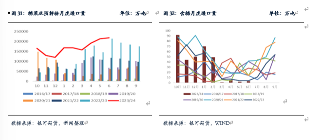 替代品方面,考虑到今年发布的公告,2024年第44号文(关于调整海关特殊监管区域和区外加工贸易食糖管理措施的公告),以及财关税(2024)7号文《关于边民互市贸易进出口商品不予免税清单的通知》,限制在保税区内加工的糖浆和预拌粉,目前暂未涉及原产地加工后出口的替代品,受此影响,本年度替代品进口尚存不确定性,后续还需关注该方面进口的限制政策。据海关总署统计数据显示,2024年1-5月,我国税则号170290项下三类商品共进口73.02万吨,同比增加9.52万吨,增幅15.00%。2023/24榨季截至5月,我国税则号170290项下三类商品共进口114.55万吨,同比增加32.67万吨,增幅39.89%。