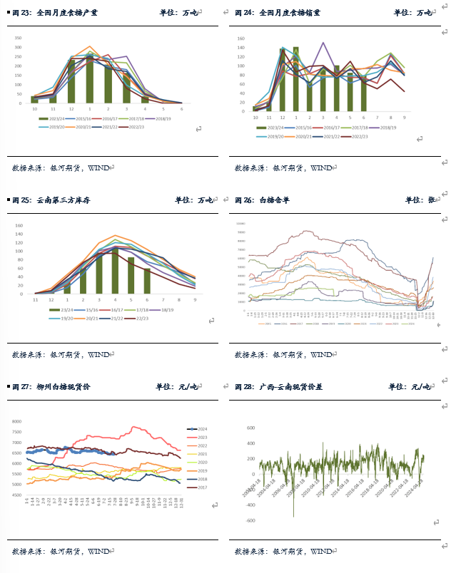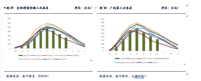 降雨增多将拖累压榨进度,而干燥天气虽然利于甘蔗压榨,但是对于甘蔗的单产或有不利影响。后续随着甘蔗压榨周期的拉长,单产数据将逐步体现,若单产受天气影响有所下降,或将导致甘蔗数量不及预期,糖厂或将面临提前收榨的情况。