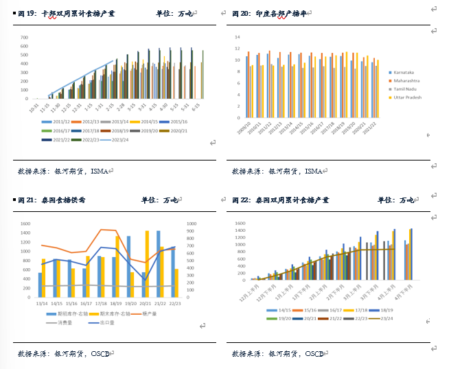 国际方面,国际方面,2024/25榨季在主产国增产预期的背景下,预计全球供需格局正在向过剩转变,国际糖价重心已逐步下修。不过考虑到目前市场对巴西新榨季甘蔗压榨数量有所担忧,预计原糖价格在18美分左右或有所支撑。