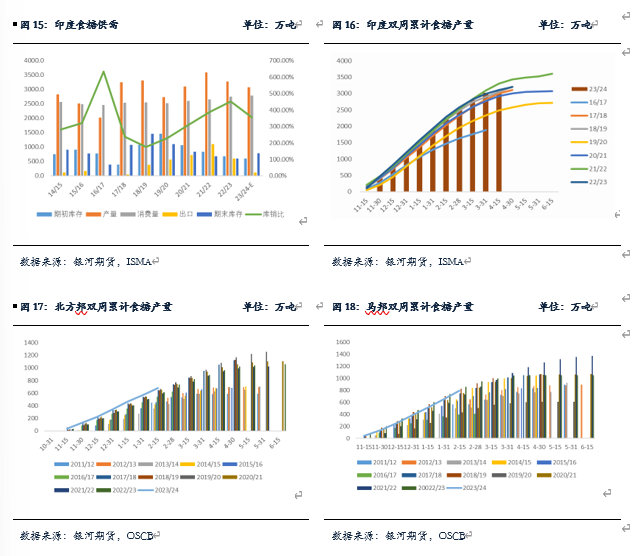 新榨季甘蔗&食糖产量与天气情况方面,季风的到来带动印度和泰国的降雨量有所增加,对新榨季甘蔗生长有一定促进作用。印度气象办公室表示,预计印度2024年6-9月的季风降雨水平将为长期均值的106%(2023年6-9月季风降雨量比平均水平低6%左右),但东北部地区降雨可能低于正常水平,该情况或将影响新榨季甘蔗的产量。除此以外,印度继续推行乙醇E20目标,新榨季甘蔗生产食糖或将受此影响。考虑到不确定因素较多,市场对于印度新榨季食糖产量预估差异较大。