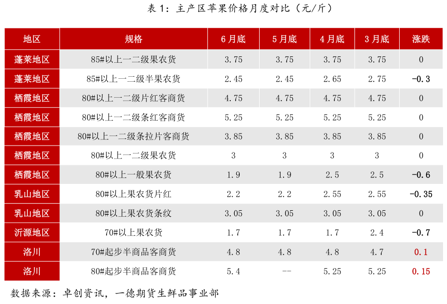 库存果价格以跌为主,低质货源下滑幅度较大。本产季主流成交价格整体呈下滑趋势,不同规格货源价格波动差异明显,从卓创资讯监测数据来看,以山东地区为例,80#以上一二级货源山东加权价格6月份均价为3.79元/斤,较1月份下滑0.65元/斤,下滑幅度14.64%,较去年6月均价低0.47元/斤,同比跌幅11.03%;果农统货价格从3.2元/斤左右下滑至6月份1.4-1.6元/斤,下滑幅度达到53.12%。