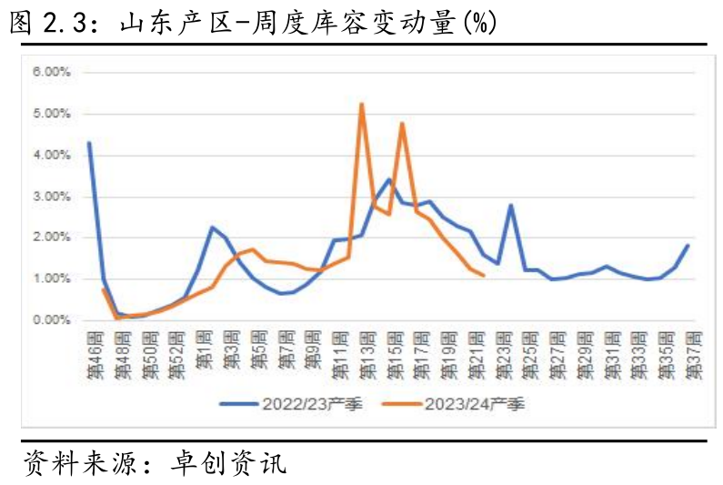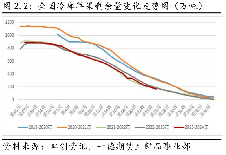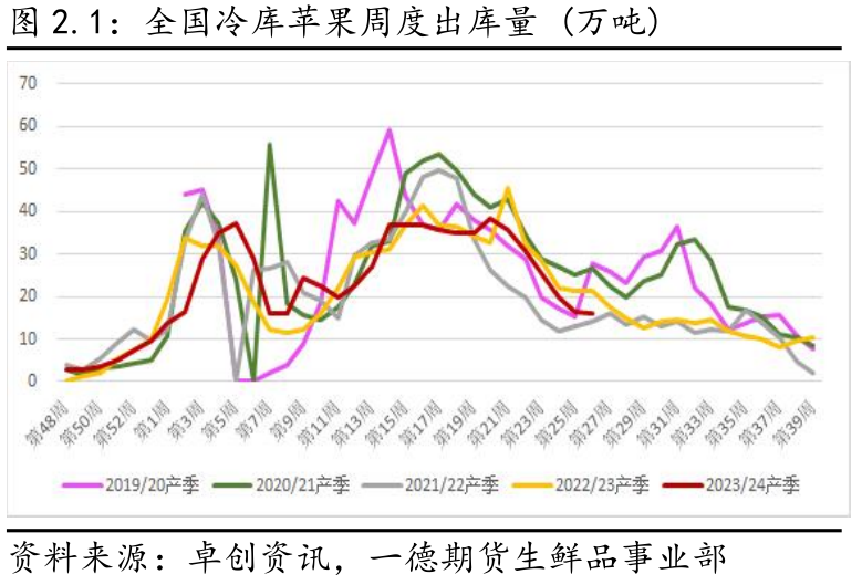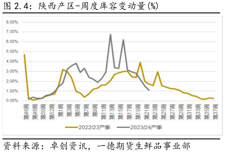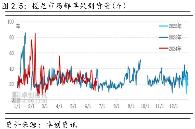 库存分析。截止到2024年6月27日全国冷库目前存储量约为154.06万吨,去库存率为82.73%,较2023年增加4.24%,其中山东产区剩余95.73万吨,陕西产区剩余32.19万吨。入库结构失衡,好货占比偏少,果农存惜售情绪,差货供应相对充足,销售压力仍存。