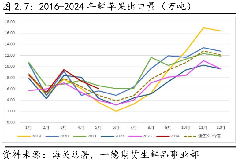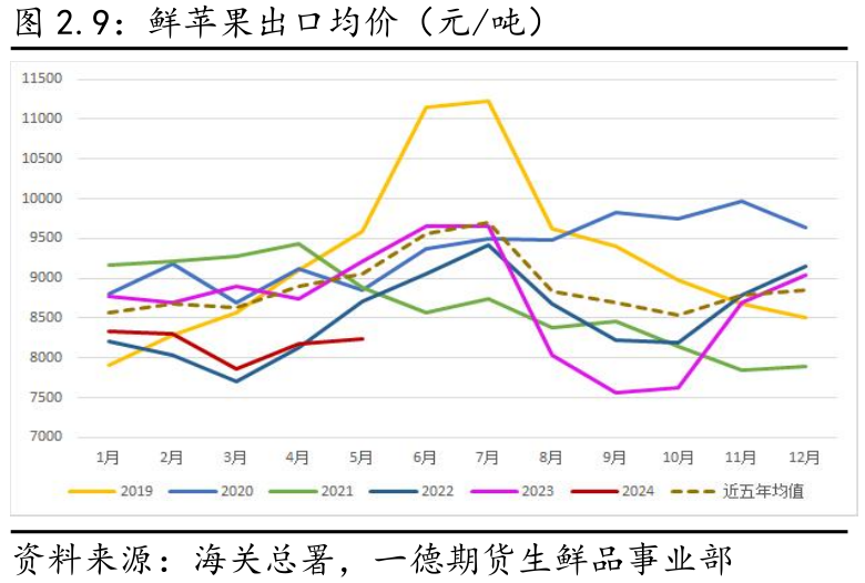 出口均价均低于近五年均值。本产季适合出口的货源价格下滑幅度较大,贸易商订单存在一定利润空间,低成本在一定程度上促进当前鲜苹果出口量。