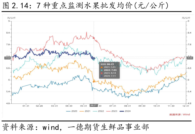 数据显示,截止到6月21日,7种重点监测水果批发均价7.11元/公斤,仅次于2023年同期(8.14元/公斤)。以西瓜为例,6月14日批发价3.7元/公斤(近五年均价为4.14元/公斤),而苹果批发价8.93元/公斤(近五年均价为8.58元/公斤)。
