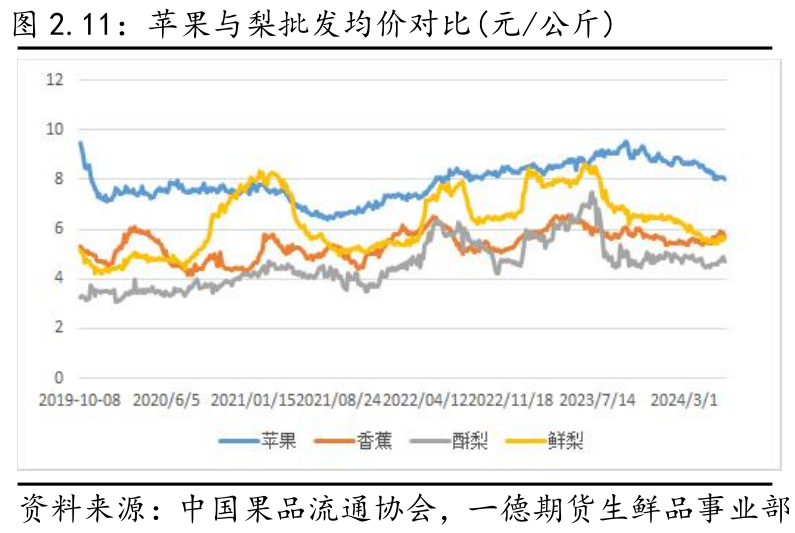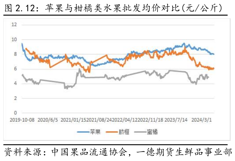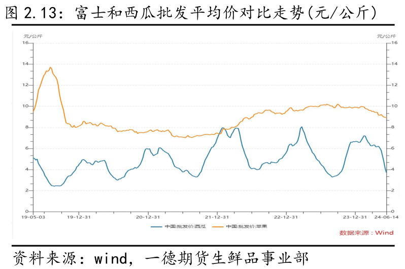 一季度对苹果形成主要替代的水果为柑橘类和梨类,以及榴莲、车厘子、草莓等反季高端水果,进入二季度,西瓜、桃类、芒果、菠萝、甜瓜、葡萄、樱桃等鲜果上市量逐渐增加,水果市场供给充足,竞争激烈,主流价格下滑较往年下滑明显,同时由于国家政策开放,进口水果大量增加,以及电商平台价格战对传统市场冲击,造成今年水果市场整体低价,对苹果形成较强替代。
