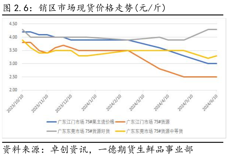优差货价格两极分化明显。以广东江门市场为例,6月底75#果主流报价3.0元/斤,75#货源报价2.5元/斤,较1月初下滑1.00元/斤;以广东东莞市场为例,6月底75#货源中等货报价3.3元/斤,较1月初持平,75#货源好货报价4.3元/斤,较1月初上涨0.3元/斤。