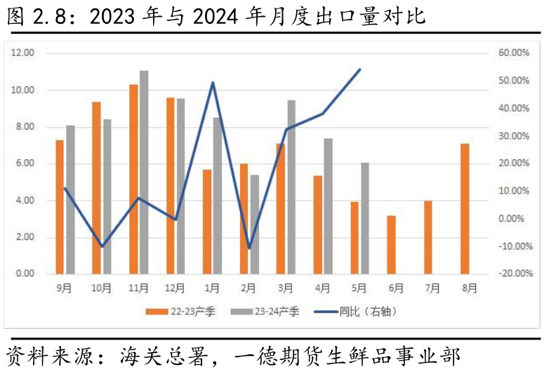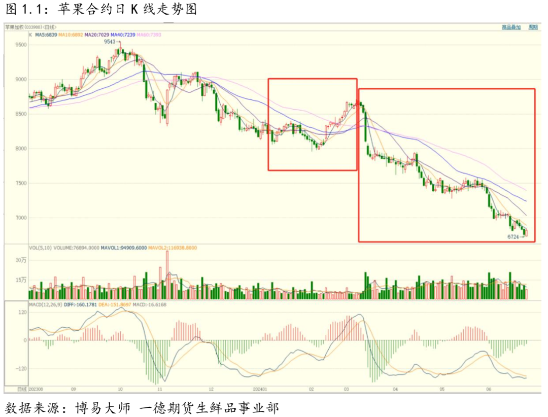 节后3月初-至今,期价一路下跌。第一阶段,随着交割利多因素逐渐被交易,而现货延续弱势,盘面打掉交割赋予的高升水。第二阶段,4月中上旬产区陆续进入花期,主产区天气正常,市场炒作预期落空,随后通过对坐果期、套袋期调研结果显示,供应呈环比增势,新季增产预期较强,虽然交割品质放宽适用于2411合约后,但期货新季合约均受到市场气氛影响,10合约期价跌幅超20%。