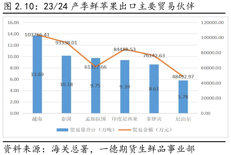新季生长表现。陕西产区早熟苹果花期较去年推迟7-10天。个别地区表现出花量不及去年,多数地区花量相对正常,整体处于正常年份,西北产区总体套袋进度略有推迟,部分地区实际套袋量比果农预期稍好。山东产区新季苹果花期较去年提前5-7天,套袋时间也比往年稍有提前。从产地反馈情况来看,今年花量较大、坐果良好,尤其是山东半岛产区表现较好。通过调研情况来看,苹果开花期间,气温相对稳定,未见明显的低温或者冻害等情况出现,预计不会出现明显果绣等质量问题。