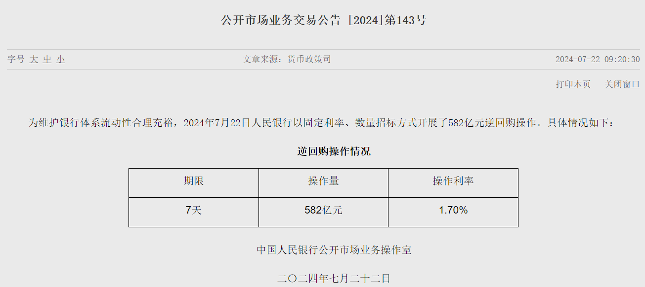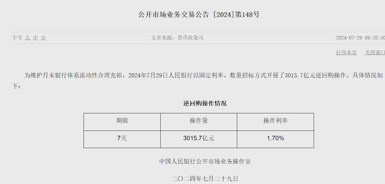 央行7月29日公告,为维护月末银行体系流动性合理充裕,央行以固定利率、数量招标方式开展了3015.7亿元逆回购操作,中标利率为1.70%,与此前持平。数据显示,今日有582亿元7天期逆回购到期,因此央行当日实现净投放2433.7亿元。