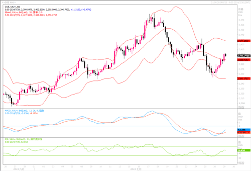 技术层面,4小时级别图上,MACD金叉向上,主多信号;形态上,连阳回升,碎阳模式为主,形成的6连阳回升;上轨道预期会逐步下压,当前上轨道位在2430附近位置;也就是上周的二阶段开跌口的位置。短线上的压力位置2412附近。日线级别图来看,随机指标趋向于钝化和粘合,暂时不会延续暴跌;相反,慢牛回升修正的概率比较大。上周五修正之后,顶底转换的支撑位置在2350上下形成。