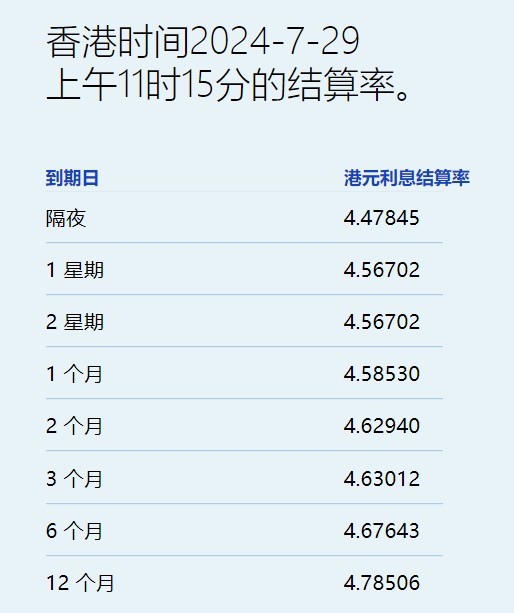 7月29日,港元拆息全线向下,与楼按相关的一个月拆息报4.5853%,跌3.22基点,为7月8日以来最低。反映银行资金成本的三个月拆息报4.63012%,跌1.042基点。隔夜息跌1.941基点,报4.47845%,连跌三日,为5月16日以来最低,两周拆息跌6.947基点,报4.56702%。六个月及一年期亦分别跌1.643基点及1.28基点,报4.67643%及4.78506%。