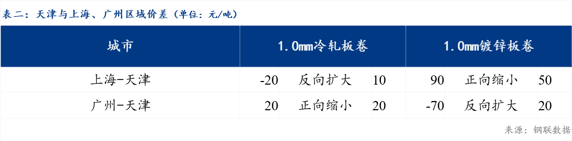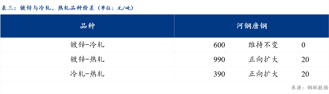区域价差来看,上海-天津镀锌板卷价差方向正向缩小50元/吨、广州-天津镀锌板卷价差反向扩大20元/吨,现上海-天津、广州-天津镀锌板卷价差分别为90元/吨和-70元/吨。品种价差来看,天津镀锌-冷轧价差维持不变、天津镀锌-热轧板卷价差均正向扩大20元/吨,现天津镀锌-冷轧、天津镀锌-热轧板卷价差分别为600元/吨和990元/吨。