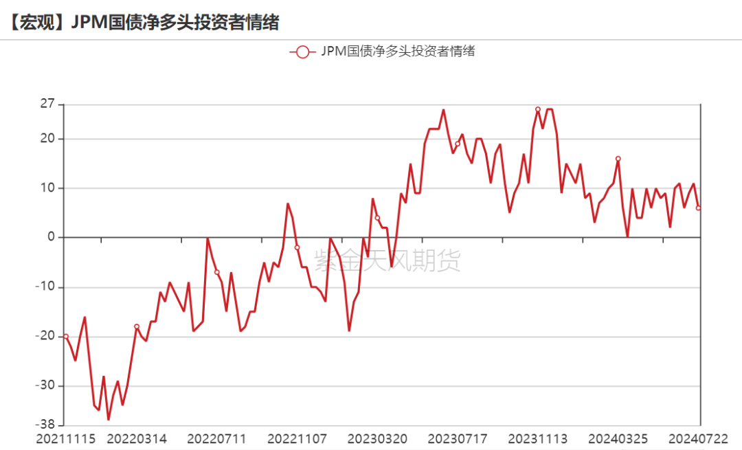 截至7.22当周,JPM国债净多头投资者情绪较上周小幅回落。