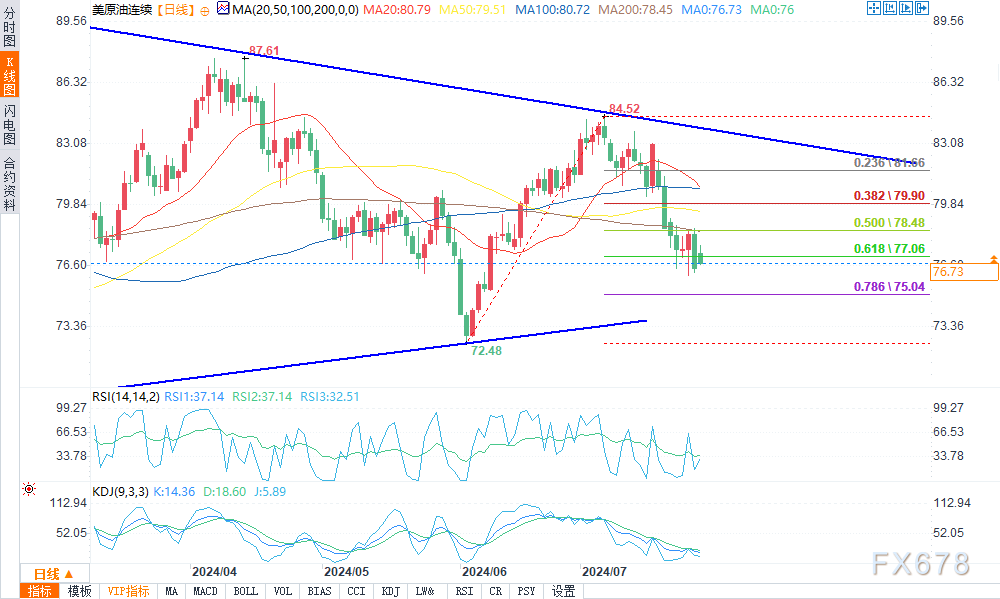 WTI原油期货呈现区间波动趋势,50%支撑位和阻力位分别位于76.89美元和77.75美元。