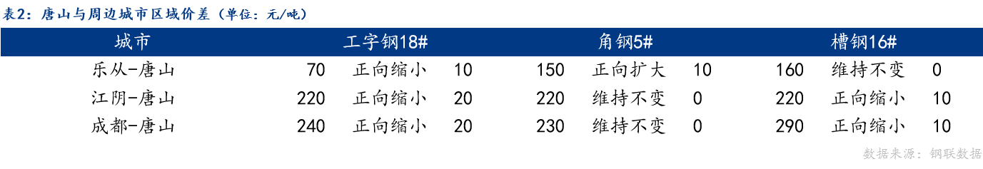从区域价差来看,乐从江阴成都工字钢,与唐山工字钢价差正向缩小;乐从角钢与唐山角钢价差正向扩大;江阴成都槽钢与唐山槽钢价差正向缩小。