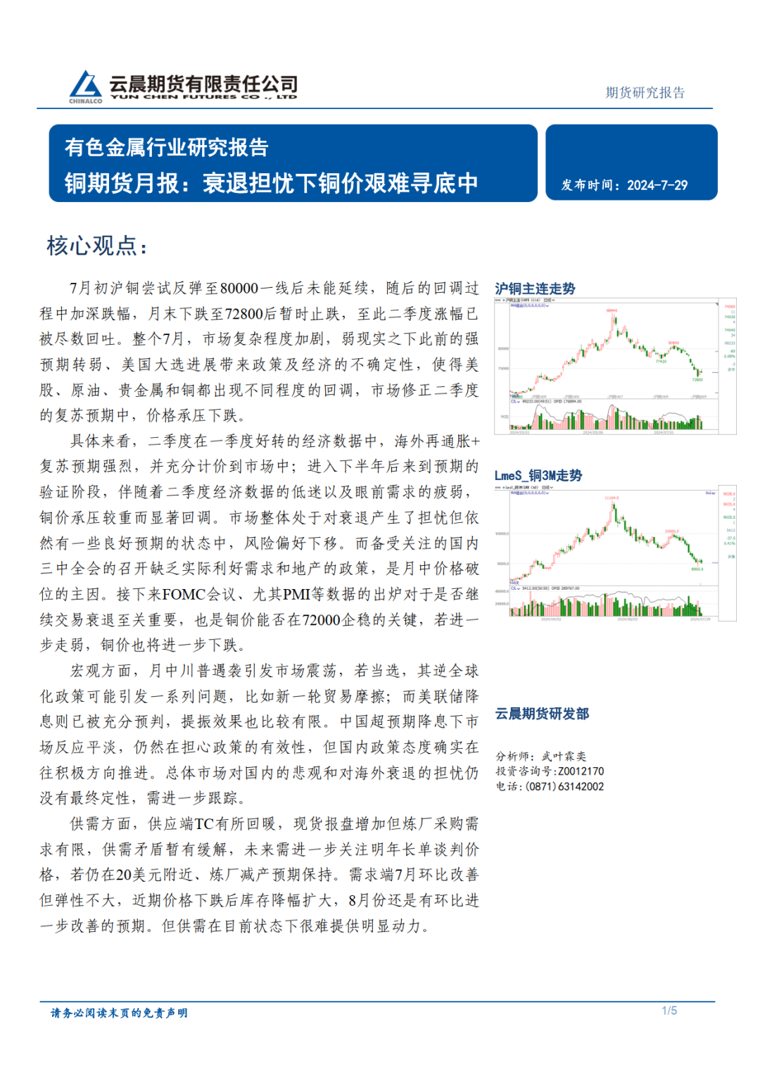 具体来看,二季度在一季度好转的经济数据中,海外再通胀+复苏预期强烈,并充分计价到市场中;进入下半年后来到预期的验证阶段,伴随着二季度经济数据的低迷以及眼前需求的疲弱,铜价承压较重而显著回调。市场整体处于对衰退产生了担忧但依然有一些良好预期的状态中,风险偏好下移。而备受关注的国内三中全会的召开缺乏实际利好需求和地产的政策,是月中价格破位的主因。接下来FOMC会议、尤其PMI等数据的出炉对于是否继续交易衰退至关重要,也是铜价能否在72000企稳的关键,若进一步走弱,铜价也将进一步下跌。