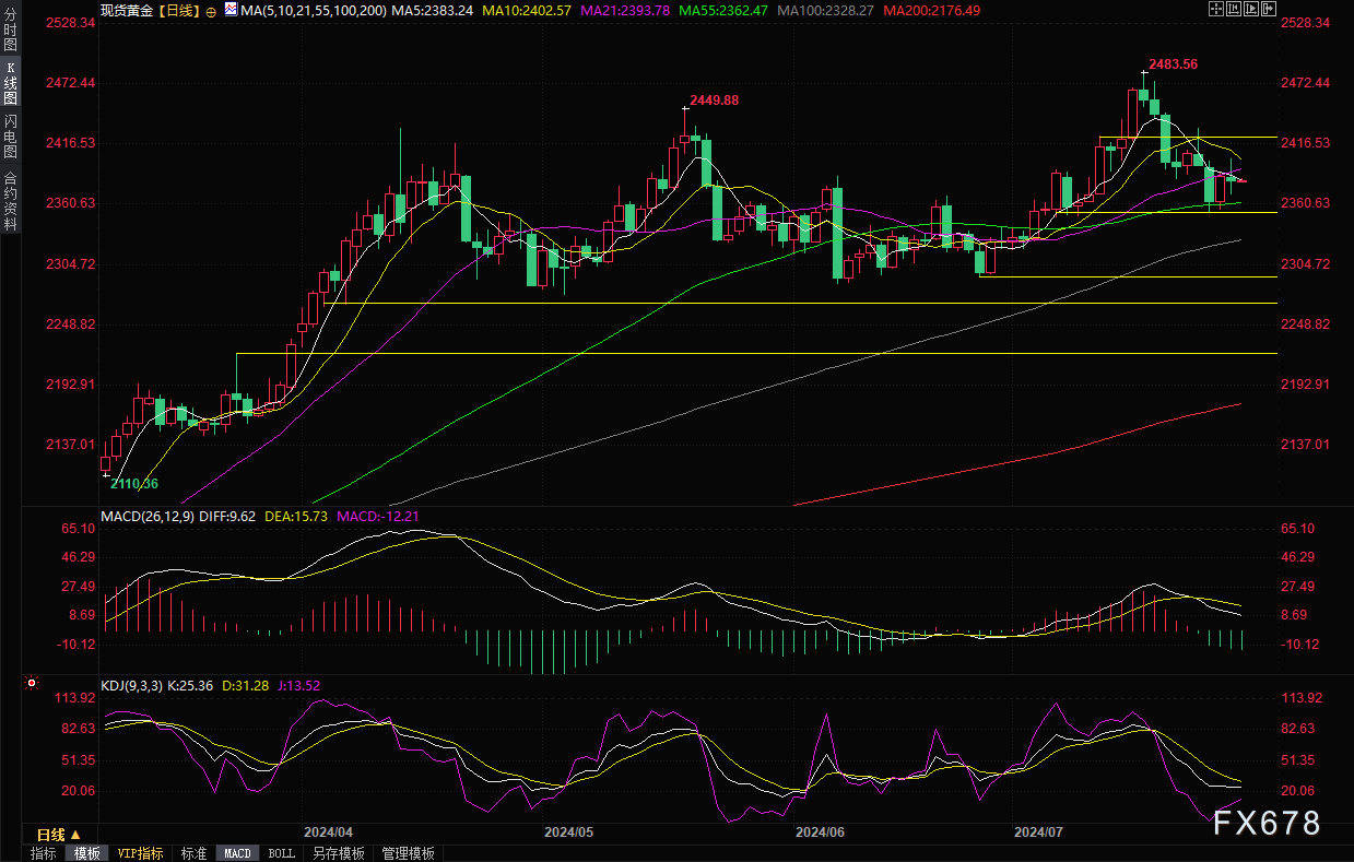 汇通财经APP讯——周二(7月30日)亚市早盘,现货黄金窄幅震荡,目前交投于2383.94美元/盎司附近。金价周一回落0.2%,收报2383.44美元/盎司,受累于美元上涨,另外,以色列和黎巴嫩引发的避险情绪很快消退,投资者等待美联储政策会议出现任何有关降息的迹象。