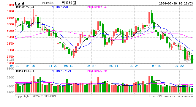 近日随着聚酯工厂减产发酵,PTA自身供需走弱的预期叠加宏观偏弱,PTA2409合约再次下跌,最低至5706元/吨,刷新年内次新低,PTA后市怎么看?
