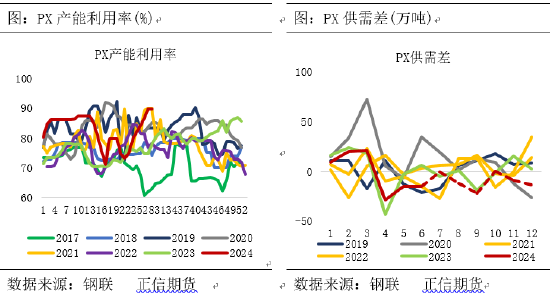 PX-CFR中国价格由7月初的1044美元/吨下滑至7月25日的995.67美元/吨,主要原因是原油价格下滑,叠加PX自身供应回升。ICE布油期货09合约价格由7月初高点87.43美元/桶下滑至7月25日82.37美元/桶,在地缘政治局势缓和,叠加需求担忧情绪仍在,国际油价下跌,成本支撑不足。供应回升主要源自两个方面:一是国内产能的扩张,2019至2023年PX产能由2254万吨猛增至4373万吨,复合增长率高达18.02%。二是检修结束后,产能利用率的快速恢复,4、5月检修季PX装置集中检修,至6、7月份已无新增检修装置,已检修装置逐渐回归,PX周均产能利用率回升至89.71%的高位,有效缓解了前期供应紧张的局面。