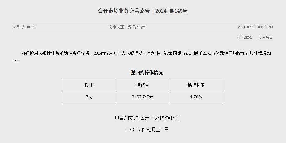 央行7月30日公告,为维护月末银行体系流动性合理充裕,央行以固定利率、数量招标方式开展了2162.7亿元逆回购操作,中标利率为1.70%,与此前持平。数据显示,今日有2673亿元7天期逆回购到期,因此央行当日实现净回笼510.3亿元。