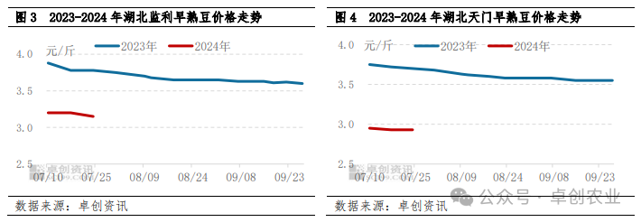 湖北新季早熟豆7月上旬零星开始上市,从监利、天门的早熟537,到当前天门、荆门等地的冀豆开始零星上市,虽然时间上略早于往年同期,但前期受当地天气因素影响,整体上市节奏并不快,且新季早熟豆价格定位较往年同期相对理性,湖北天门等地早熟豆净粮装车价格在2.90-2.95元/斤,较当期陈粮早熟豆价格基本持平,但较去年同期新粮上市阶段的明显“低调”,价格同比下跌20%左右,而监利地区早熟豆净粮手工豆装车价格3.15-3.20元/斤,较去年新粮上市价格低0.60元/斤,同比下跌17%左右。虽近日个别区域价格略有小幅走高,但较往年新豆上市的价格明显偏理性。