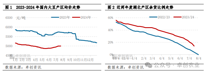 自2023年新季大豆上市起,至2024年5月中旬,国内大豆现货市场呈现跌跌不休态势,主产区均价由9月中旬的5700元/吨跌至2024年5月中旬4866元/吨,跌幅834元/吨,跌幅接约15%。尤其是今年3-5月,黄淮海产区大豆基层余货压力较大,经销商及基层种植户出货意愿强烈,纷纷竞价出货,持续的杀跌心态使得该区域价格下滑幅度较大,但在此阶段,湖北产区多地经销商因持货商成本较高,主动降价出货意愿较弱,故湖北产区降价节奏明显慢于黄淮海产区,虽然在一定程度上使得亏损程度有所降低,但相对偏高的价格缺使得湖北货在各销区市场的性价比降低,在黄淮海产区稳步降库存的阶段,湖北产区的余货压力依旧不减,这也使得本年度湖北产区陈豆消化速度偏慢,往年二季度末基本消化殆尽的湖北货,今年新季黄豆上市仍有余货。