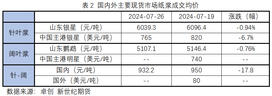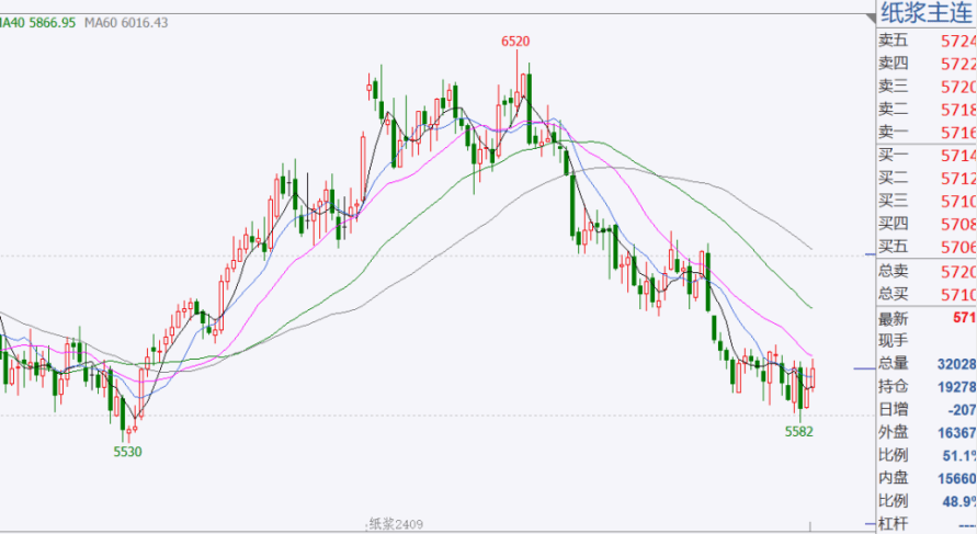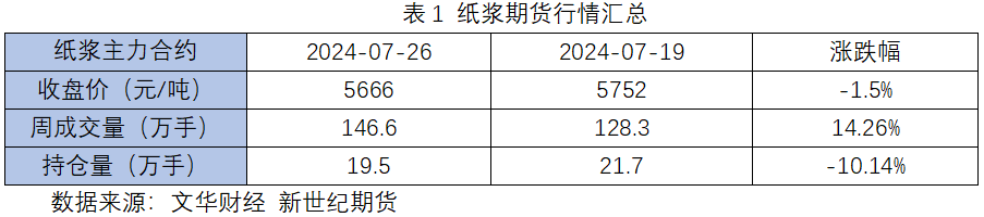 截至7月26日,纸浆主力合约SP2409收盘价5666元/吨,较上周收盘价下跌1.5%。本周SP2409合约的累计成交量为146.6万手,较上周增加14.26%。SP2409合约的持仓量为19.5万手,较上周减少10.14%。