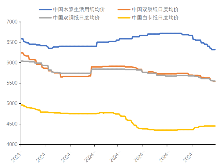 生活用纸:本周生活用纸企业让利降库,纸价继续下跌。本周木浆生活用纸均价6347元/吨,较上周下跌1.70%,跌幅扩大0.48个百分点。影响价格走势因素如下:第一,因国际浆价下跌、市场看空情绪影响,下游加工厂低价、少量采买,市场价格重心下跌;第二,部分纸企存让利出货情况,商谈空间较为宽松,引起市场重心下跌,采浆情绪偏淡。