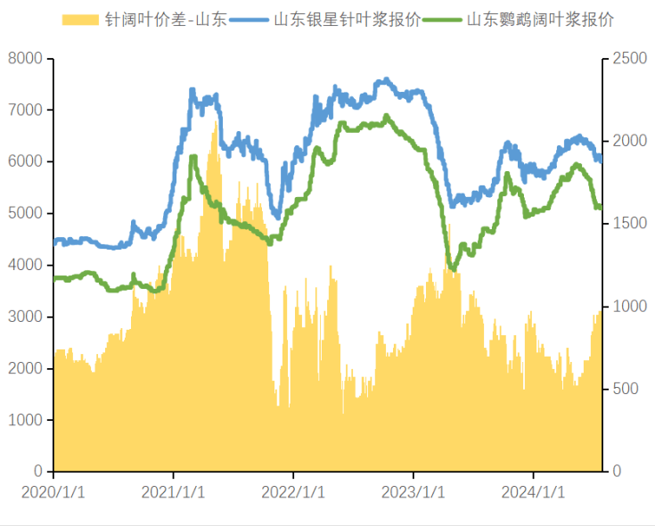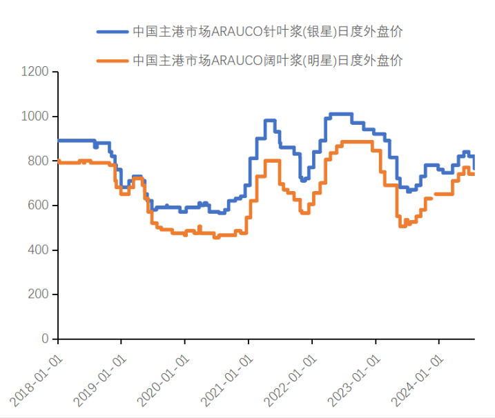 针叶浆现货市场价格,7月26日当周山东银星均价为6039.3元/吨,较上周均价下跌0.94%,中国主港银星最新价为765美元/吨,较上周下跌6.7%;阔叶浆现货市场价格,7月26日当周山东鹦鹉均价为5107.1元/吨,较上周均价下跌0.76%,中国主港明星暂无最新报价。7月26日当周国内针阔价差为932.2元/吨,价差缩小17.8元/吨。