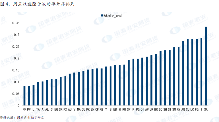 分板块的波动率来看,除了农产品之外,各板块的期权隐含波动率均有所上涨,其中涨幅最大的能化板块整体交易量加权隐含波动率上涨约1.05%。烧碱因行情突破下行,期权波动率上升超6%,截至周五的隐波约为23%,但流动性较低,最高日成交量仅约5.8万张。BR橡胶和棉花期权成交量也因日度震荡幅度放大而升波,同时日成交量放大。而菜粕期权随着行情企稳降低交易量,隐含波动率也同步下降。