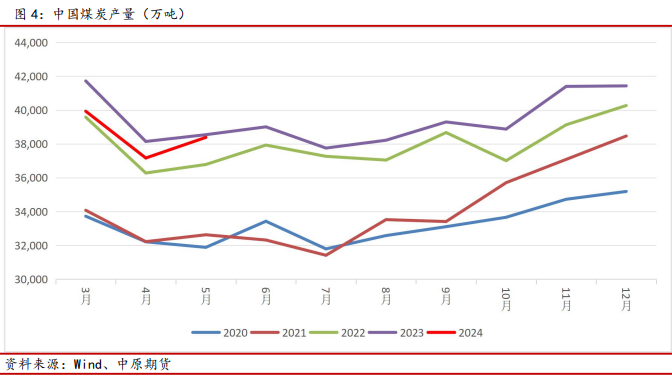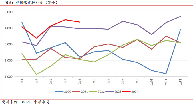 2024年上半年,国内煤炭市场重心整体走弱。具体来看,1月延续僵持弱稳局面,而后受春节假日影响,下游阶段性补库,煤炭价格随之小幅上涨;进入3月,随着气温回升,居民用电量下降,终端需求疲软,煤价开始进入加速下行通道;进入5月,在铁路优惠政策助推下,下游提前备货,叠加旺季行情兑现,煤价再度掉头向上;但5月下旬之后,市场再度进入僵持弱稳局面。以鄂尔多斯动力煤为例,截止7月5日,年内累计下跌约6.4%,和去年同期价格基本持平。供给方面,国家统计局数据显示,2024年1-5月国内煤炭产量是18.6亿吨,同比去年下降3%;其中内蒙地区5.2亿吨,同比增长2.7%,山西地区4.7亿吨,同比减少15%。山西减量较为明显,其中集团矿减量占比较大,主要受安全生产要求等因素影响。根据Mysteel523家煤矿数据,523家样本矿1-6月平均开工率为83.29%,同比去年下降12.66%。进口方面,据海关总署最新数据显示,2024年1-5月累计进口煤20497万吨,同比增长12.6%。